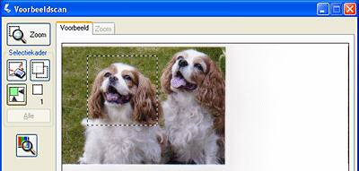 om daarmee een selectiekader in de afbeelding te plaatsen. Dit kader geeft aan welk deel wordt gescand. U kunt dit selectiekader nu naar wens aanpassen. Zie Scangebied (Selectiekader) aanpassen voor instructies. Opmerking: