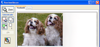 Als u op een afbeelding wilt inzoomen, klikt u ergens in het scangebied en vervolgens op de knop Zoom. Er wordt een nieuwe voorbeeldscan gemaakt, die vervolgens groter wordt weergegeven op het tabblad Zoom. (De andere afbeeldingen op het tabblad Voorbeeldscan behouden hun oorspronkelijke grootte.)