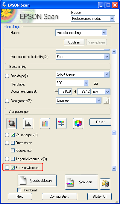 Ga als volgt te werk om stof te verwijderen met Epson Scan.