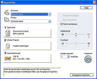 Klik onder in het venster op de knop Aangepast kopiëren als u vóór het afdrukken een scanvoorbeeld wilt zien of als u nog meer kopieerinstellingen wilt opgeven. Klik op Help in Copy Utility voor meer informatie over het gebruik van de functies voor aangepast kopiëren.