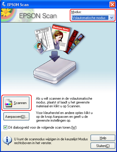 Dubbelklik op het pictogram EPSON Scan op het bureaublad. Andere mogelijkheid: selecteer Start > Alle programma's of Programma's > EPSON Scan > EPSON Scan.