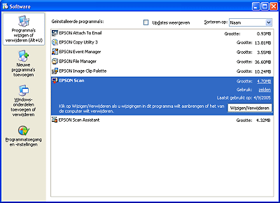 Klik op EPSON Scan in de lijst met geïnstalleerde programma's en klik vervolgens op Wijzigen/Verwijderen (Windows XP en 2000) of Toevoegen/Verwijderen (Windows ME en 98).