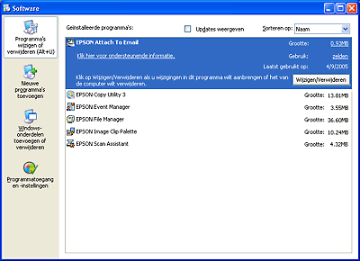 Klik op EPSON E-mailen in de lijst met geïnstalleerde programma's en klik vervolgens op Wijzigen/Verwijderen (Windows XP en 2000) of Toevoegen Verwijderen (Windows ME en 98).