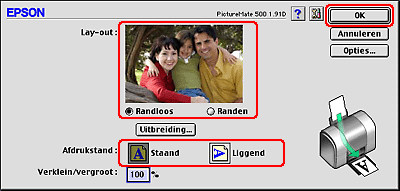 ![]() | Selecteer Randloos of Randen als afdruklay-out. |