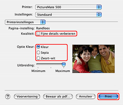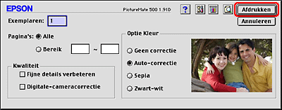 ![]() | Selecteer PictureMate 500 bij Printer. Geef vervolgens de gewenste instellingen op bij Aantal en pagina's. |