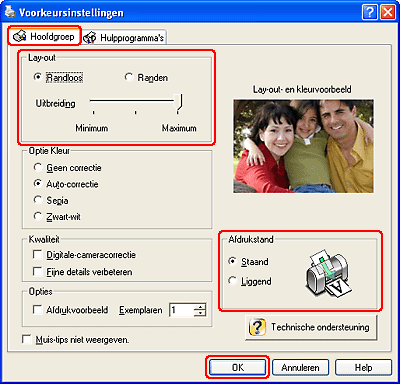 ![]() | Klik op het tabblad Hoofdgroep en selecteer Randen of Randloos als afdruklay-out. |