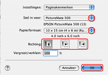 ![]() | Selecteer PictureMate 500 bij Stel in voor. |