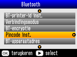 Als u Koppeling selecteert als aansluitingsmodus of als u BT-encryptie op Aan zet, moet eerst een code worden ingevoerd in het Bluetooth-apparaat voordat het kan communiceren met de printer. Deze code staat standaard op 0000.