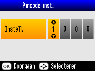 Met deze instelling kunt u de viercijferige code instellen die vóór het afdrukken moet worden ingevoerd in het apparaat, als Koppeling is geselecteerd als communicatiemodus of als Encryptie op Aan is gezet.