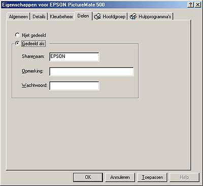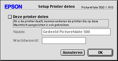 Schakel het selectievakje Deze printer delen (Share this Printer) in en typ vervolgens, indien nodig, de naam van de printer en een wachtwoord.