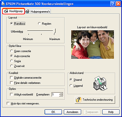 Via het tabblad Hoofdgroep kunt u de instellingen vastleggen voor de Lay-out, Kleuroptie, Kwaliteit, Opties en Afdrukstand. Raadpleeg het betreffende gedeelte hierna.