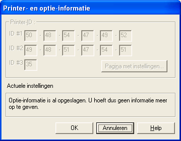 Afhankelijk van de configuratie van uw systeem kan de informatie in het dialoogvenster Printer- en optie-informatie automatisch worden bijgewerkt. Het is echter ook mogelijk dat u de gegevens met de hand moet invoeren.