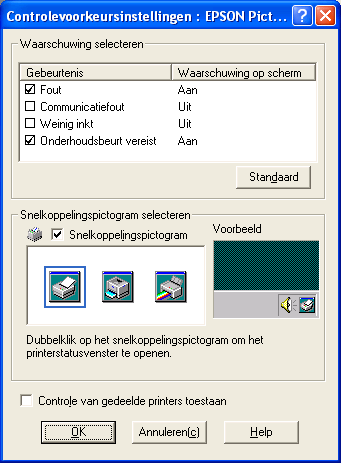 Klik op deze knop om het dialoogvenster Controlevoorkeursinstellingen te openen, waarin u instellingen kunt vastleggen voor EPSON Status Monitor 3.