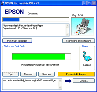 Het venster met de voortgangsbalk verschijnt automatisch wanneer u een afdruktaak start. In dit venster kunt u de status van het PicturePack controleren. Klik in het venster met de voortgangsbalk op de knop Print Pack controleren om de status van de fotocartridge weer te geven (zie illustratie).