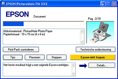 TipsIn het tekstvak onderaan het venster van de voortgangsbalk worden tips weergegeven voor een optimaal gebruik van uw Epson-printerdriver. Als u meer informatie wilt over een tip die wordt weergegeven, klikt u op Details.