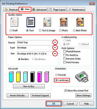 Selecteer Envelope (Enveloppe) als instelling voor Media Type (Afdrukmateriaal) en maak de gewenste instellingen voor het afdrukken. Zie de online-Help voor meer informatie over Print Settings (Printerinstellingen).
