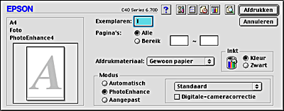 ![]() | Controleer in het afdrukvenster of de instellingen voor Afdrukmateriaal en Inkt kloppen. Zie Opties voor Inkt instellen of Afdrukmateriaal instellen voor meer informatie. |