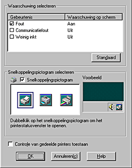 Klik op deze knop om het dialoogvenster Controlevoorkeursinstellingen te openen, waarin u instellingen kunt vastleggen voor EPSON Status Monitor 3.
