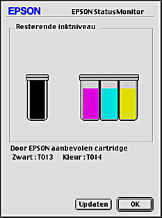 U kunt dit programma ook gebruiken om vóór het afdrukken het inktniveau te controleren. EPSON StatusMonitor toont hoeveel inkt er nog rest vanaf het moment dat u het programma hebt geopend. Als u de informatie over de hoeveelheid resterende inkt wilt actualiseren, klikt u op de knop Updaten.