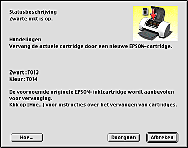 Als een cartridge (bijna) leeg is verschijnt de knop Hoe. Als u op de knop Hoe klikt, leidt EPSON StatusMonitor u stapsgewijs door de procedure voor het vervangen van de cartridge.