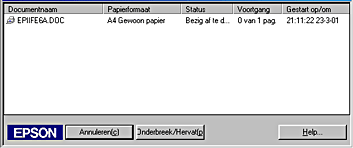 EPSON Spool Manager is vergelijkbaar met Afdrukbeheer onder Windows. Als twee of meer afdruktaken tegelijk worden ontvangen, worden deze vastgehouden in de volgorde waarin ze zijn ontvangen. (Bij printers in een netwerk wordt dit een afdrukwachtrij genoemd.) Als een afdruktaak bovenaan komt te staan, wordt deze door EPSON Spool Manager naar de printer gestuurd. Vanuit Spool Manager kunt u informatie over de afdrukstatus weergeven voor de afdruktaken die naar de printer zijn gestuurd. Bovendien kunt u geselecteerde afdruktaken annuleren, onderbreken en hervatten.