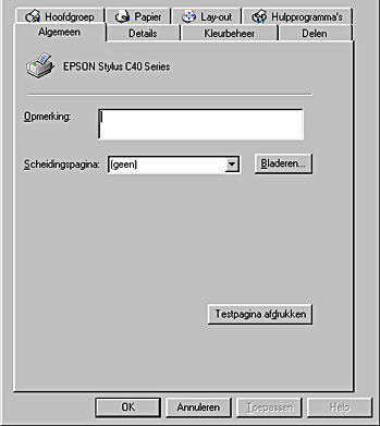 Wanneer u Windows 2000 gebruikt, moet u de printersoftware installeren aan de hand van de stappen die staan beschreven op het blad Installatie dat bij de printer is geleverd. Anders kan het universele Microsoft-stuurprogramma worden geïnstalleerd. Ga als volgt te werk om te controleren of het universele stuurprogramma is geïnstalleerd.
