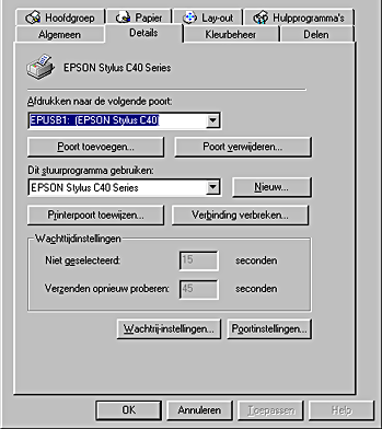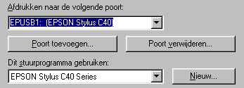Als EPUSBx: (EPSON Stylus C40 Series of EPSON Stylus C20 Series) wordt weergegeven in de keuzelijst Afdrukken naar de volgende poort (Print to the following port), dan zijn het stuurprogramma voor de USB-printer en de printersoftware goed geïnstalleerd. Als de juiste poort niet is geïnstalleerd, gaat u door met de volgende stap.