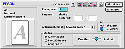 Met de opties voor Modus in het afdrukvenster hebt u de beschikking over drie besturingsniveaus voor de printersoftware. Dit wordt hierna uitgelegd.