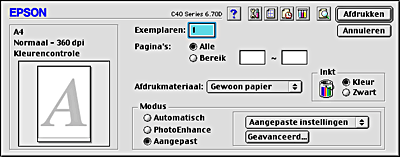 ![]() | Selecteer in het afdrukvenster onder Modus de optie Aangepast en klik vervolgens op de knop Geavanceerd. Het dialoogvenster Geavanceerd wordt geopend. |