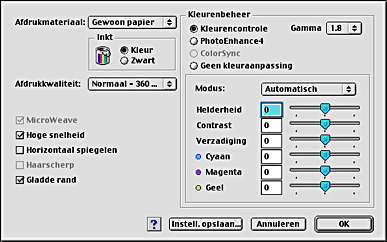 Als u in het afdrukvenster de optie Automatisch selecteert als instelling bij Modus, worden alle gedetailleerde instellingen automatisch door het printerstuurprogramma verzorgd op basis van de huidige instellingen bij Afdrukmateriaal en Inkt. Zie Opties voor Inkt instellen voor informatie over het instellen van Inkt. Zie Afdrukmateriaal instellen voor informatie over het instellen van Afdrukmateriaal.