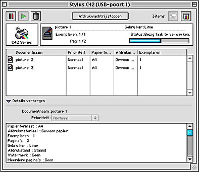Nadat u een afdruktaak naar de printer hebt gestuurd, kunt u met behulp van het hulpprogramma EPSON Monitor3 afdruktaken die in de wachtrij staan, bekijken, annuleren of van volgorde wijzigen. Het hulpprogramma toont bovendien de status van de huidige afdruktaak.