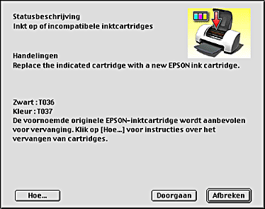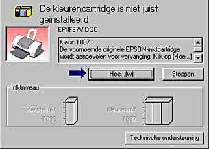 Als de inkt (bijna) op is, verschijnt onder het tekstvak een knop Hoe. Als u op Hoe klikt, wordt u door EPSON Status Monitor 3 stap-voor-stap begeleid bij de procedure voor het vervangen van de cartridge.