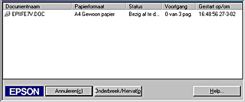 EPSON Spool Manager is vergelijkbaar met Afdrukbeheer onder Windows. Als twee of meer afdruktaken tegelijk worden ontvangen, worden deze vastgehouden in de volgorde waarin ze zijn ontvangen. (Bij printers in een netwerk wordt dit een afdrukwachtrij genoemd.) Als een afdruktaak bovenaan komt te staan, wordt deze door EPSON Spool Manager naar de printer gestuurd. Vanuit Spool Manager kunt u informatie over de afdrukstatus weergeven voor de afdruktaken die naar de printer zijn gestuurd. Bovendien kunt u geselecteerde afdruktaken annuleren, onderbreken en hervatten.