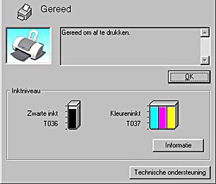 Dit venster geeft de voortgang van de huidige afdruktaak aan en bevat informatie over de printerstatus wanneer communicatie in twee richtingen tussen de printer en de computer tot stand is gebracht. In dit venster verschijnen bovendien foutberichten en nuttige tips voor het afdrukken. Raadpleeg het betreffende gedeelte hierna.