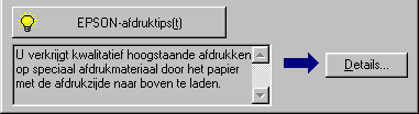 In het tekstvak onderaan het venster van de voortgangsbalk worden tips weergegeven voor een optimaal gebruik van uw EPSON-printersoftware. Er verschijnt een nieuwe tip om de 30 seconden. Als u meer informatie wilt over een tip die wordt weergegeven, klikt u op Details.