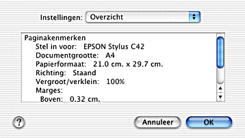 Als u in het dialoogvenster voor pagina-instelling onder Instellingen de optie Samenvatting hebt geselecteerd, kunt u de huidige instellingen in het dialoogvenster voor pagina-instelling bevestigen.