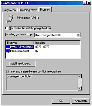 ![]() | Selecteer in de lijst Instelling gebaseerd op (Setting based on) een basisconfiguratie die dezelfde instelling voor Invoer-/uitvoerbereik (Input/Output Range) heeft als de instelling die u in stap 4 hebt genoteerd. Zorg er bovendien voor dat het kanaal voor Directe geheugentoegang (Direct Memory Access channel) en de nummers voor Interrupt request zijn toegewezen en worden weergegeven. In de lijst met apparaten die een conflict veroorzaken dient Er zijn geen conflicten (No conflicts) te worden weergegeven. |