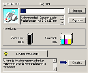 EPSON Spool Manager is vergelijkbaar met Afdrukbeheer onder Windows. Als twee of meer afdruktaken tegelijk worden ontvangen, worden deze vastgehouden in de volgorde waarin ze zijn ontvangen. (Bij printers in een netwerk wordt dit een afdrukwachtrij genoemd.) Als een afdruktaak bovenaan komt te staan, wordt deze door EPSON Spool Manager naar de printer gestuurd. Via de Spool Manager kunt u afdruktaken annuleren. Van de afdruktaken die naar de printer zijn gestuurd kunt u de status weergeven en u hebt de mogelijkheid om afdruktaken te onderbreken en te hervatten of om ze opnieuw te starten.