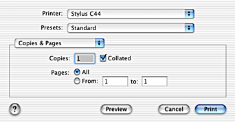 You can make Media Type, Mode, Ink, Copies, and Pages settings in the Print dialog box. From this dialog box, you can preview the document before printing. Refer to the appropriate section below.