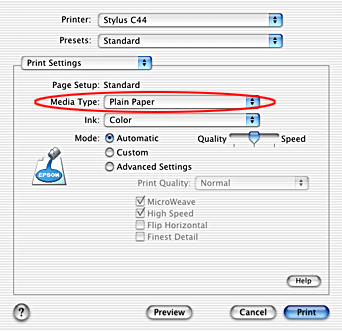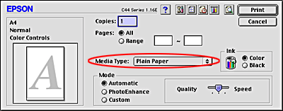Select the desired Media Type setting in the Print dialog box with Print settings selected, and then select the desired Paper Size setting in the Page Setup dialog box.
