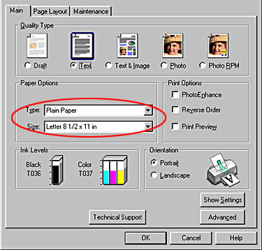 Select the desired Size and Type settings under Paper Options on the Main menu.