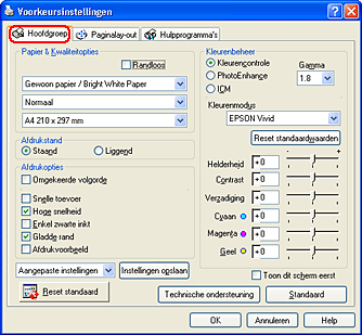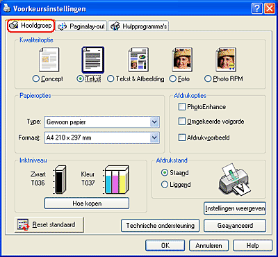 Via het tabblad Hoofdgroep kunt u de instellingen vastleggen voor Kwaliteitoptie, Papieropties, Afdrukopties, Afdrukstand en een aantal geavanceerde instellingen. Ook kunt u hier de inktniveaus controleren. Raadpleeg het betreffende gedeelte hierna.