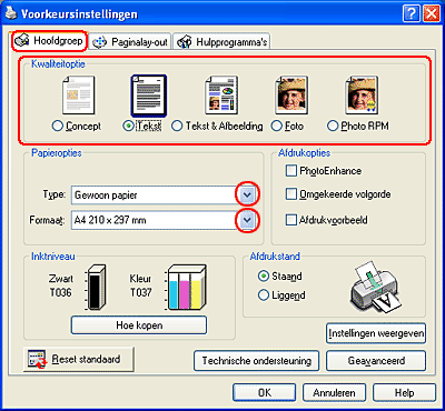 Klik op het tabblad Hoofdgroep en geef de gewenste instelling op bij Kwaliteitoptie. Raadpleeg het hierna genoemde gedeelte voor meer informatie over de instellingen voor Kwaliteitoptie. Zie Kwaliteitoptie