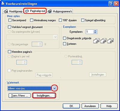 ![]() | Klik op het tabblad Paginalay-out, selecteer het gewenste watermerk in de lijst Watermerk en klik op Instellingen. |