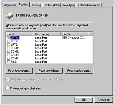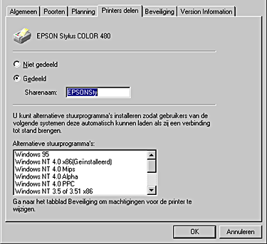 In dit gedeelte wordt uitgelegd hoe u de printer configureert zodat deze kan worden gebruikt door andere computers in het netwerk. Als u de EPSON Stylus COLOR 480 als een gedeelde printer gebruikt, kunt u bewerkingen zoals het vervangen van cartridges en het verwijderen van vastgelopen papier, alleen uitvoeren vanaf de computer waarop de printer rechtstreeks is aangesloten. Vanaf computers die via een netwerk met de printer zijn verbonden, kunnen alleen bepaalde bewerkingen worden uitgevoerd.