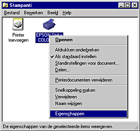 Dubbelklik in het Configuratiescherm op het pictogram Printers, klik met de rechtermuisknop op het pictogram van de printer en klik vervolgens in het menu op Eigenschappen.