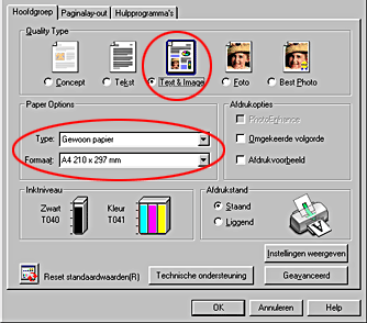 ![]() | Klik op het tabblad Hoofdgroep en selecteer Gewoon papier en A4 bij Papieropties, en Tekst en afbeelding bij Kwaliteitstype. |