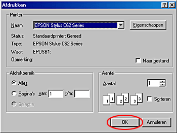 ![]() | Klik in het dialoogvenster dat verschijnt op Printer, Instellingen (Setup), Opties (Options) of Eigenschappen (Properties). (Het is mogelijk dat u op een combinatie van deze knoppen moet klikken, afhankelijk van de toepassing die u gebruikt.) De printersoftware wordt geopend. |