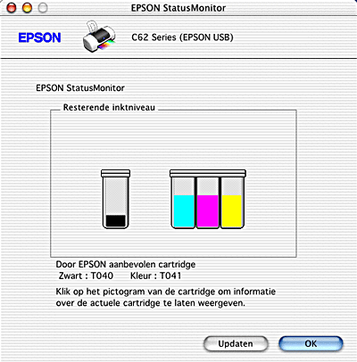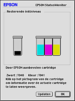 U kunt dit programma ook gebruiken om vóór het afdrukken het inktniveau te controleren. EPSON StatusMonitor toont hoeveel resterende inkt er nog is op het moment dat u het programma hebt geopend. Als u de informatie over de hoeveelheid resterende inkt wilt actualiseren, klikt u op Updaten.