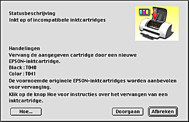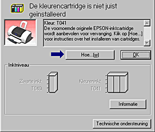 Als de inkt (bijna) op is, verschijnt onder het tekstvak een knop Hoe. Als u op Hoe klikt, wordt u door EPSON Status Monitor 3 stap-voor-stap begeleid bij de procedure voor het vervangen van de cartridge.